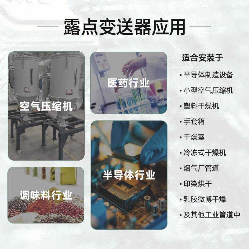 應用領域 鋰電池生產、電子元器件制造、半導體制造、電力工程設備;可集成于干燥系統、壓縮空氣系統、恒溫恒濕系統等設備中,用于氣體潮氣檢測。